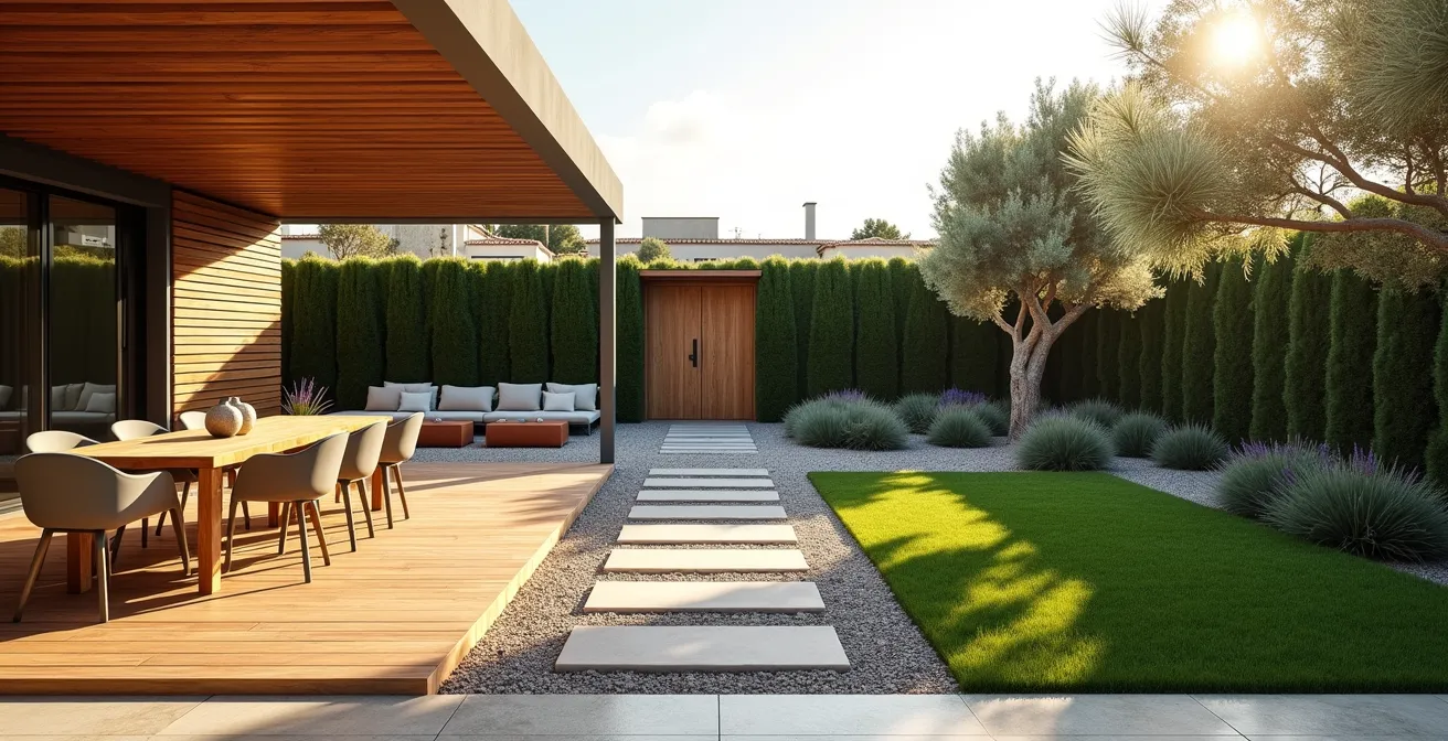 Pero, ¿y si la verdadera clave para transformar esa parcela no fuera simplemente «decorarla», sino diseñarla como un activo arquitectónico? Este es el enfoque que adoptaremos. No se trata de qué plantas poner, sino de cómo una estructura paisajística bien concebida puede crear zonas funcionales, garantizar la privacidad y, fundamentalmente, aumentar el valor de tasación de su propiedad de forma medible y segura desde el punto de vista legal.