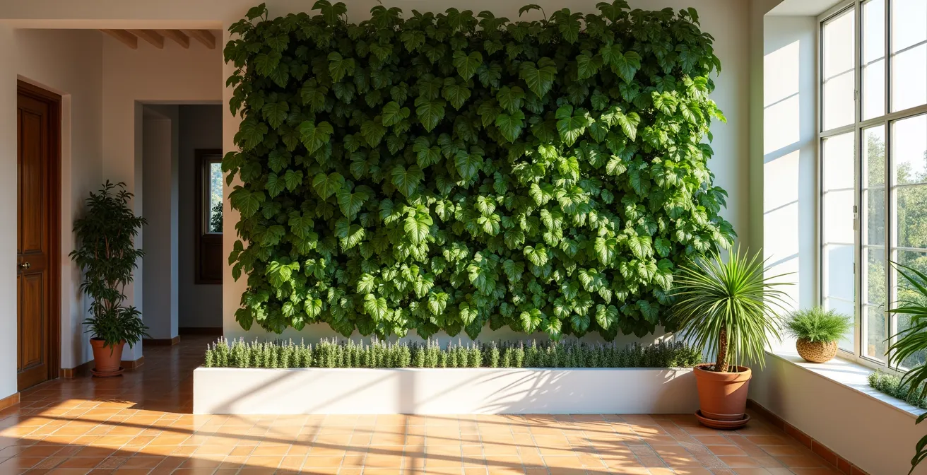 - Capa 3 (Frontal): Se utilizan plantas colgantes reales, como el Pothos o la Hiedra, situadas en macetas en la parte superior o en estantes delante del mural. Se deja que sus guías y hojas caigan y se mezclen con el follaje artificial, borrando físicamente la frontera entre lo real y lo falso.
